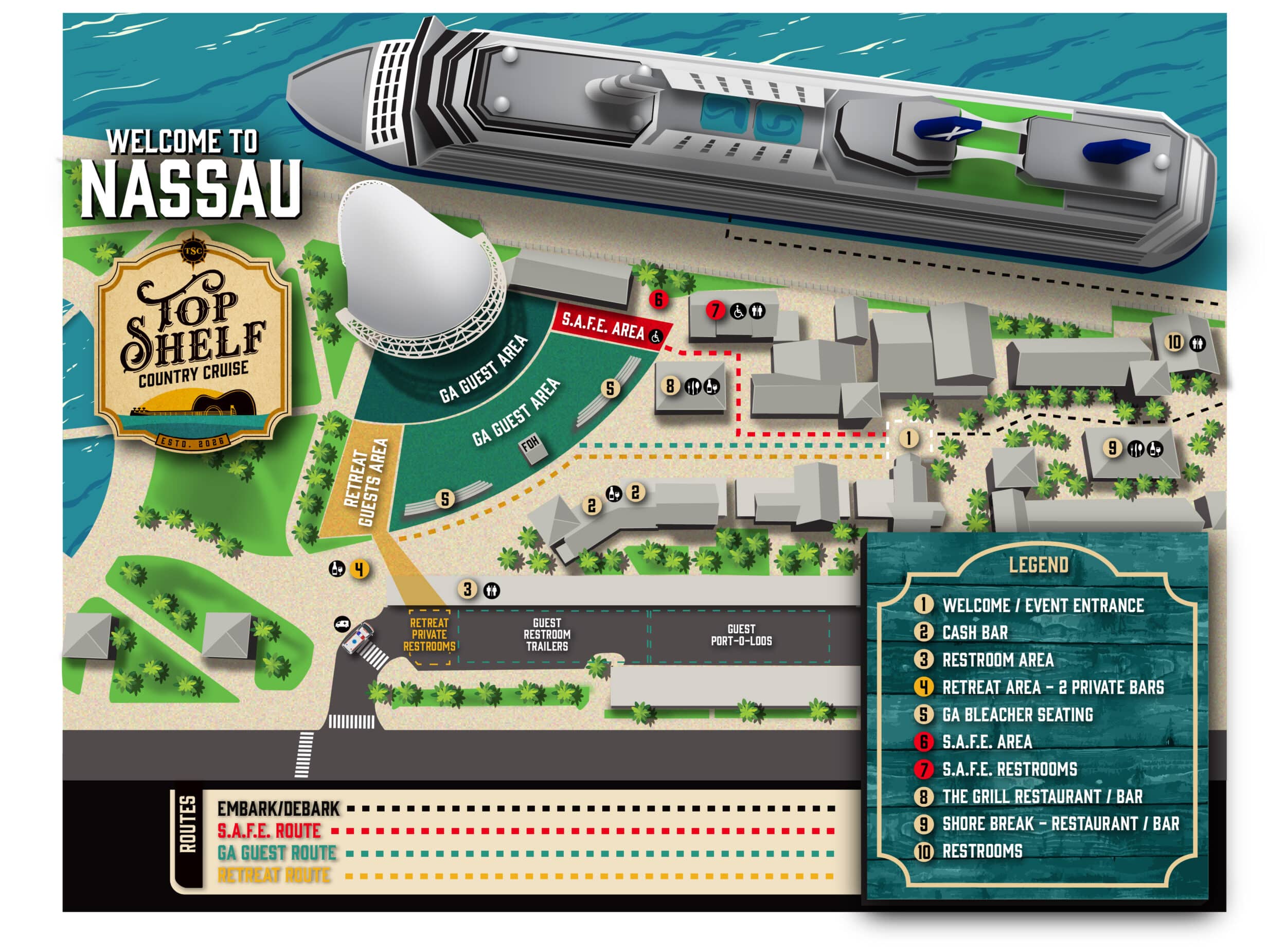 After the last note fades into the Nassau night, the party is far from over! Select amphitheater bars will remain open and operate on a cash-bar basis. You can grab a Roadie Refill, the perfect way to keep the good times going. Bartenders at the on shore venues will happily fill your cup with any drink you purchase, making it easy to bring your favorite island sips from shore to ship. The main celebration, however, awaits back on the ship. That’s right, it’s another high-energy music-filled party on board! Starting at 11:30 PM, head to the pool deck for the exhilarating Sail Out of Nassau Deck Party with Rodeo Disco! All the pool deck bars will be open and offering Sail Away Drink Specials. And to make sure you’ve got fuel in the tank to keep dancing the day away, a late night buffet will be open in the Ocean View Café to satisfy those post-concert cravings. All guests must be aboard by midnight, Nassau time. Once the deck party wraps up, we’ll be on our way to Bimini for another huge day! |